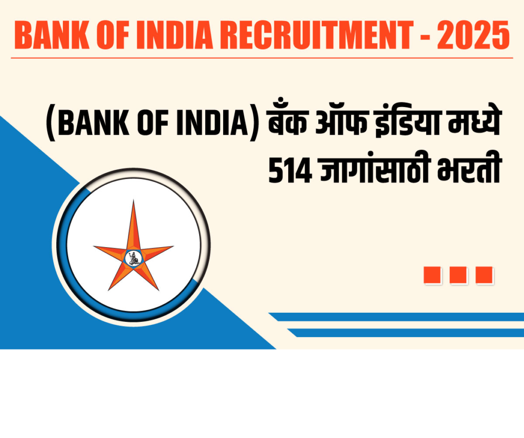 (Bank of India Recruitment) बँक ऑफ इंडिया मध्ये 514 जागांच्या भरतीची जाहिरात प्रसिद्ध झाली असून, भरतीसाठी आवश्यक शैक्षणिक पात्रता, वयोमर्यादा, परीक्षा शुल्क , नोकरीचे ठिकाणी, अर्ज करण्याची पद्धत, अर्ज करण्यासाठी लिंक , GR PDF, अधिकृत वेबसाईट इ . माहितीसाठी खालीaल माहिती पूर्ण वाचावी.