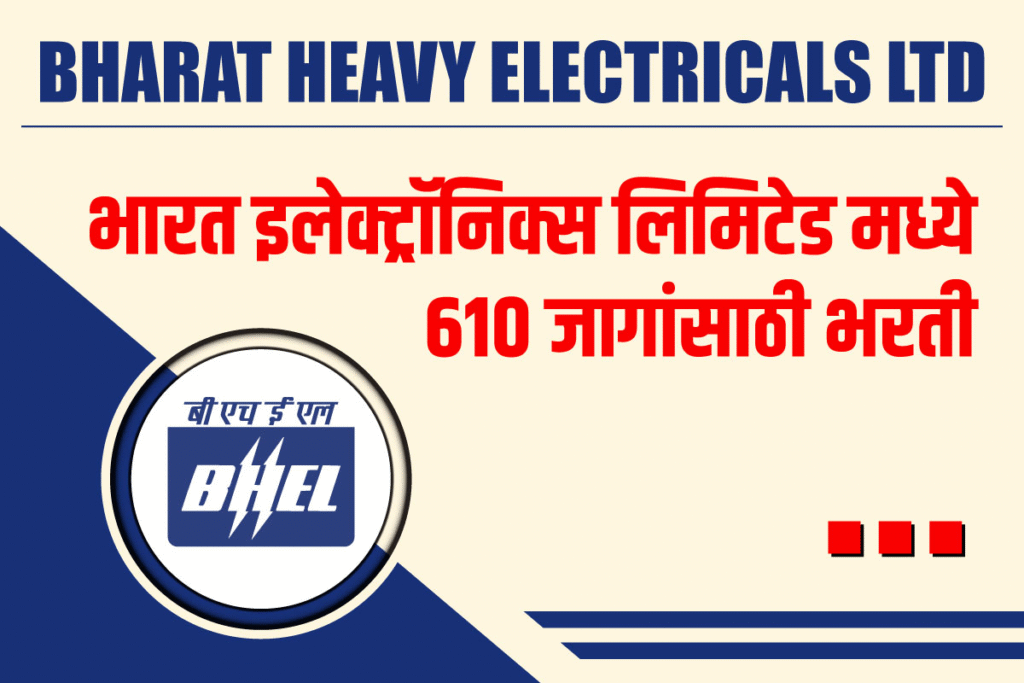(BHEL Recruitment) Bharat Heavy Electricals Limited – भारत हेवी इलेक्ट्रिकल्स लिमिटेड मध्ये ‘ट्रेनी’ पदाच्या 610 जागांसाठी भरतीची जाहिरात प्रसिद्ध झाली असून, भरतीसाठी आवश्यक शैक्षणिक पात्रता, वयोमर्यादा, परीक्षा शुल्क, नोकरीचे ठिकाणी, अर्ज करण्याची पद्धत, अर्ज करण्यासाठी लिंक, GR PDF, अधिकृत वेबसाईट इ . माहितीसाठी खालील माहिती पूर्ण वाचावी.