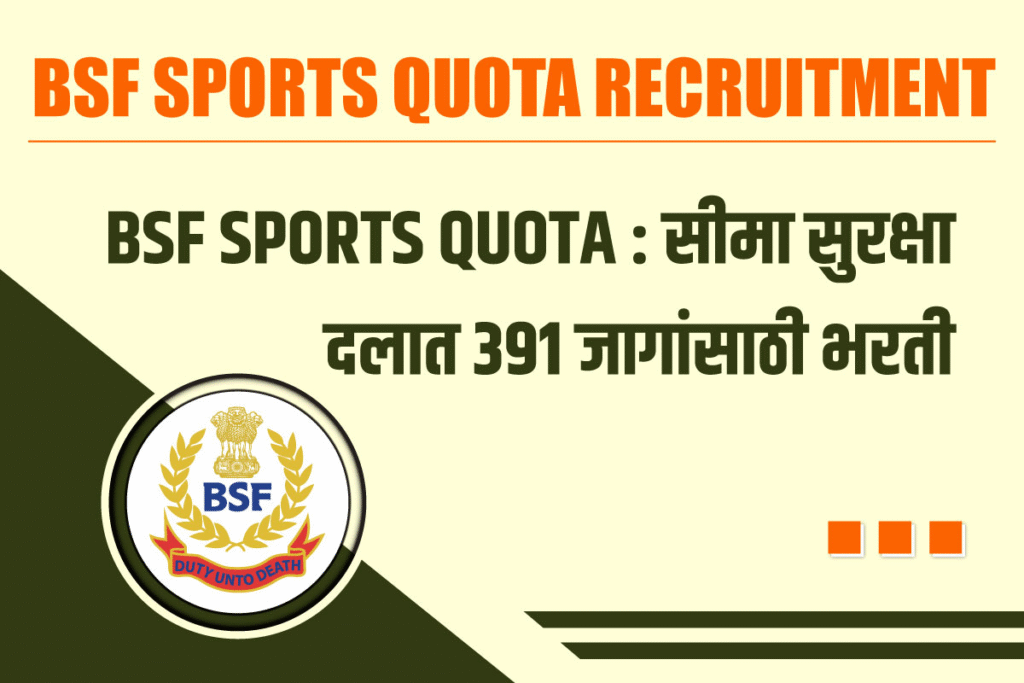 (BSF Sports Quota) सीमा सुरक्षा दलात 391 जागांच्या भरतीची जाहिरात प्रसिद्ध झाली असून, भरतीसाठी आवश्यक शैक्षणिक पात्रता, वयोमर्यादा, परीक्षा शुल्क , नोकरीचे ठिकाणी, अर्ज करण्याची पद्धत इ . माहितीसाठी खालील माहिती पूर्ण वाचावी.