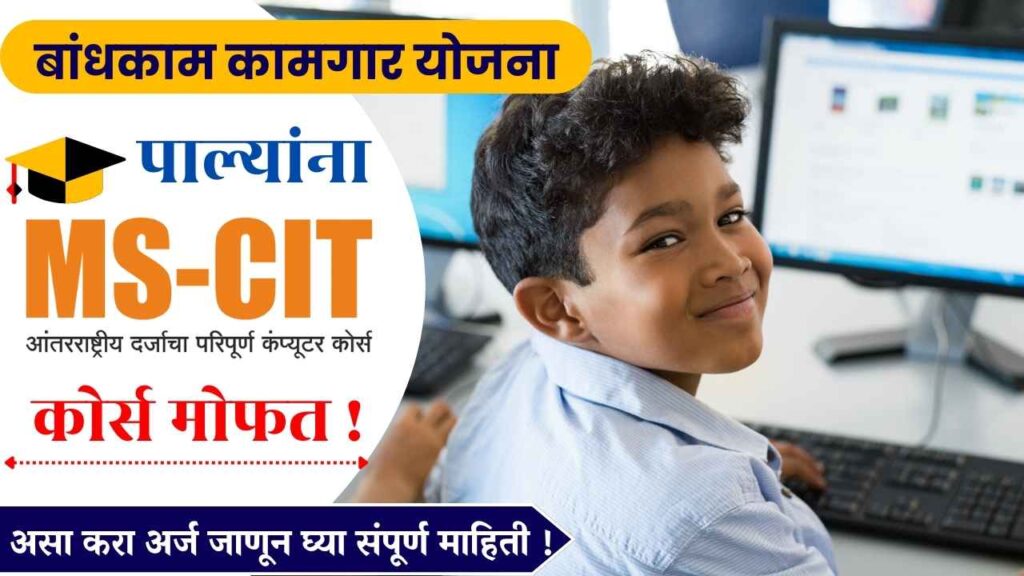 आज आपण अशीच राज्य सरकारची एक महत्त्वपूर्ण योजनांपैकी एक योजना बघणार आहोत. ती म्हणजे बांधकाम कामगारांच्या पाल्यांना मिळणार मोफत MSCIT कोर्स करण्याची संधी | Maharashtra Bandhkam Kamgar Yojana होय. प्रत्येक योजनाचा काहीना काही उद्देश व ध्येय असते. त्याच प्रमाणे बांधकाम कामगार हे हि एक महत्वाचा भाग आहेत. त्यांना उद्भवणाऱ्या समस्या व अडचणी असो किंवा त्यांचे जीवनमान कशे बदलवता येईल व त्यांना आर्थिकदृष्ट्या सक्षम करता येईल हाच उद्देश राज्य सरकारचा असतो. आपल्या बांधकाम कामगार बांधवांच्यासाठी भांड्यांचा मोफत संच, सुरक्षित विमा, मुलीचा लग्नाला आर्थिक सहाय्य, आरोग्य बाबत दक्षता घेणे, बांधकाम कामगारांच्या मुलांना उच्च शिक्षण घेता यावे. त्यांच्या पाल्यांच्या शिक्षणासाठी आर्थिक परिस्थिती आड येऊ नये यासाठी विविध योजना ह्या राबवल्या जातात. पण आता सध्या तंत्रज्ञानच युग आहे. संगणकाच ज्ञान असणे तितकेच आवश्यक झाले आहे, तर बांधकाम कामगारांच्या मुलांना संगनकाचे ज्ञान मिळावे. यासाठी महाराष्ट्र इमारत व इतर बांधकाम कल्याणकारी महामंडळ योजनेमार्फत बांधकाम कामगारांच्या पाल्यांना बांधकाम कामगारांच्या पाल्यांना मिळणार मोफत MSCIT कोर्स करण्याची संधी | Maharashtra Bandhkam Kamgar Yojana यासाठी हि योजना राबवण्यात आली आहे. 2 पाल्यांची MSCIT झाली असेल तर त्याबद्दल चा प्रवेश पावती दिल्यावर आपल्याला लागलेला MSCIT ची फीस हि बांधकाम कामगार योजनेंतर्गत परत करण्यात येईल. ह्याच योजनेला MSCIT शुल्काची प्रतीपूर्ती असे म्हणतात.