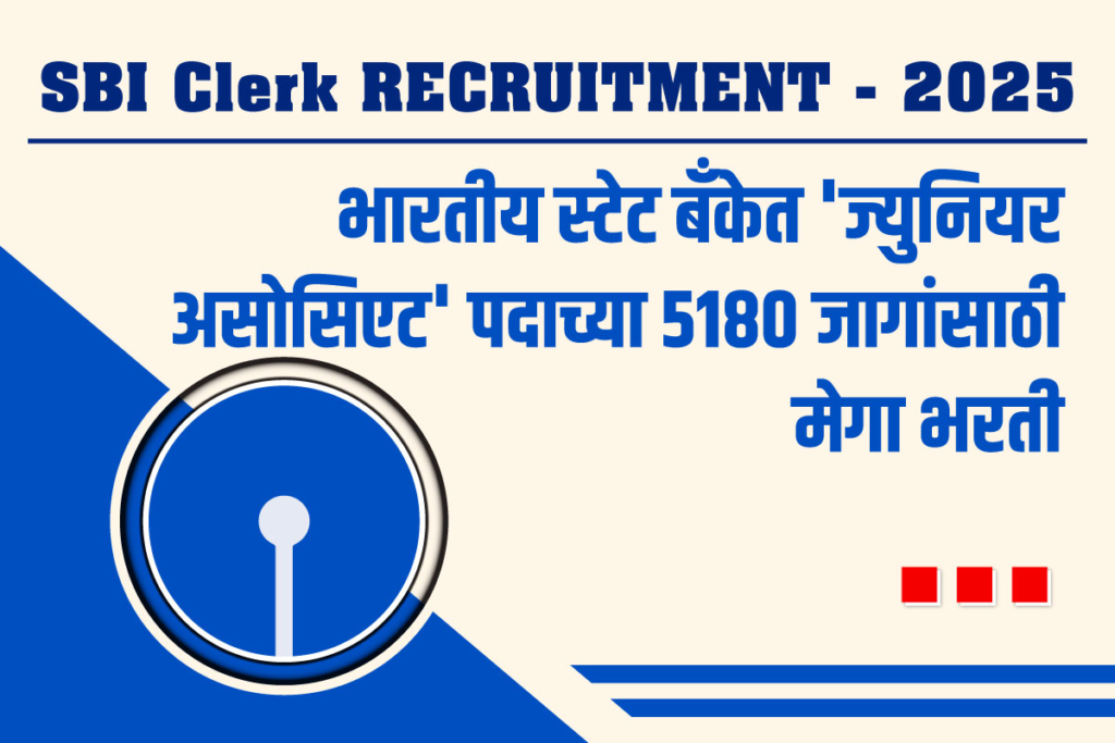 (SBI Clerk Recruitment) भारतीय स्टेट बँकेत लिपिक पदाच्या 5180 जागांसाठी भरतीची जाहिरात प्रसिद्ध झाली असून, भरतीसाठी आवश्यक शैक्षणिक पात्रता, वयोमर्यादा, परीक्षा शुल्क, नोकरीचे ठिकाणी, अर्ज करण्याची पद्धत, अर्ज करण्यासाठी लिंक, GR PDF, अधिकृत वेबसाईट इ . माहितीसाठी खालील माहिती पूर्ण वाचावी.
