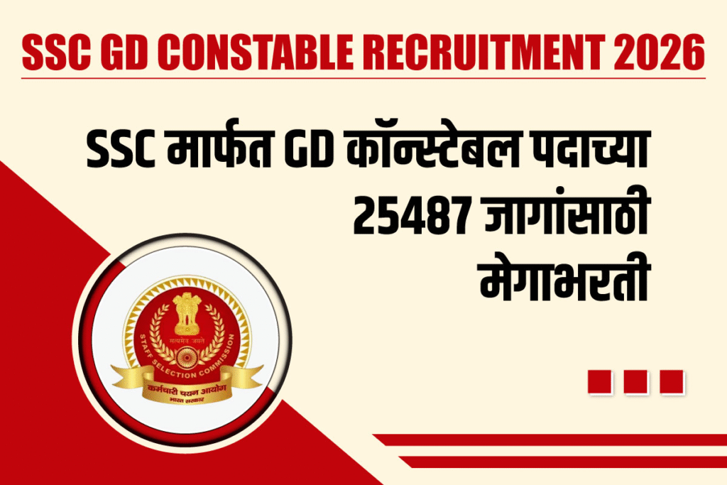 (SSC GD Constable Recruitment) SSC मार्फत GD कॉन्स्टेबल पदाच्या 25487 जागांसाठी भरतीची जाहिरात प्रसिद्ध झाली असून, भरतीसाठी आवश्यक शैक्षणिक पात्रता, वयोमर्यादा, परीक्षा शुल्क , नोकरीचे ठिकाणी, अर्ज करण्याची पद्धत, अर्ज करण्यासाठी लिंक , GR PDF, अधिकृत वेबसाईट इ . माहितीसाठी खालील माहिती पूर्ण वाचावी.