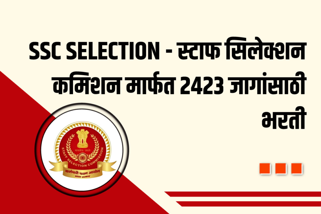 (SSC Selection Recruitment) स्टाफ सिलेक्शन कमिशन मार्फत 2423 जागांसाठी भरतीची जाहिरात प्रसिद्ध झाली असून, भरतीसाठी आवश्यक शैक्षणिक पात्रता, वयोमर्यादा, परीक्षा शुल्क , नोकरीचे ठिकाणी, अर्ज करण्याची पद्धत, अर्ज करण्यासाठी लिंक , GR PDF, अधिकृत वेबसाईट इ . माहितीसाठी खालील माहिती पूर्ण वाचावी.