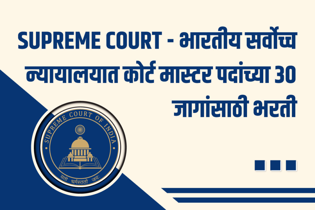 (Supreme Court Recruitment) भारतीय सर्वोच्च न्यायालयात कोर्ट मास्टर पदांच्या 30 जागांसाठी भरतीची जाहिरात प्रसिद्ध झाली असून, भरतीसाठी आवश्यक शैक्षणिक पात्रता, वयोमर्यादा, परीक्षा शुल्क , नोकरीचे ठिकाणी, अर्ज करण्याची पद्धत, अर्ज करण्यासाठी लिंक , GR PDF, अधिकृत वेबसाईट इ . माहितीसाठी खालील माहिती पूर्ण वाचावी.