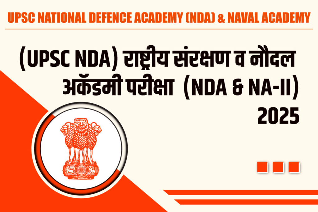 (UPSC NDA) राष्ट्रीय संरक्षण अकादमी (NDA) व नौदल अकादमी (NA-1) परीक्षा 2025 ची जाहिरात प्रसिद्ध झाली असून, भरतीसाठी आवश्यक शैक्षणिक पात्रता, वयोमर्यादा, परीक्षा शुल्क , नोकरीचे ठिकाणी, अर्ज करण्याची पद्धत इ . माहितीसाठी खालील माहिती पूर्ण वाचावी.